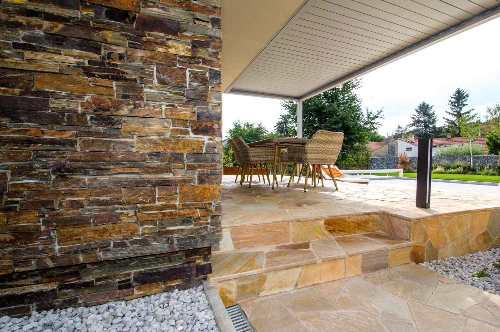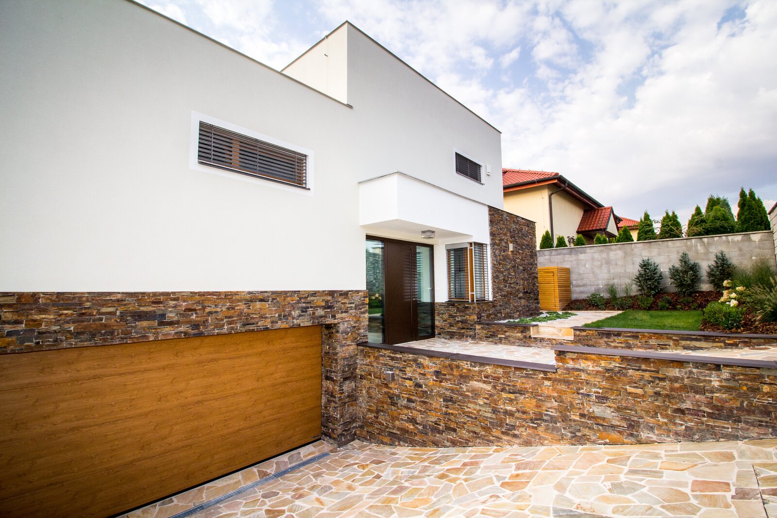 Použití kamene se v projektu opakuje na více místech – na obkladu garáže, opěrných zdech i terasách. Stejný materiál sjednocuje dům i zahradu do jednoho celku a vytváří přirozené propojení s okolím. Kombinace přírodního kamene, dřeva a zeleň dodává domu teplo a přirozenou eleganci.